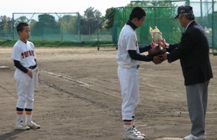 小野Bと播磨Bと組んで連合チームで挑んだ三年生親善大会決勝戦で宝塚Bに3対1で勝利し、見事優勝しました。思い起こせば、9月から始まり約2ヶ月の長丁場、色んな事がありました。香寺球場事件に始まり、三日間で五試合こなし、全国大会準優勝チームに延長戦で勝利。